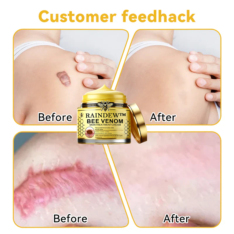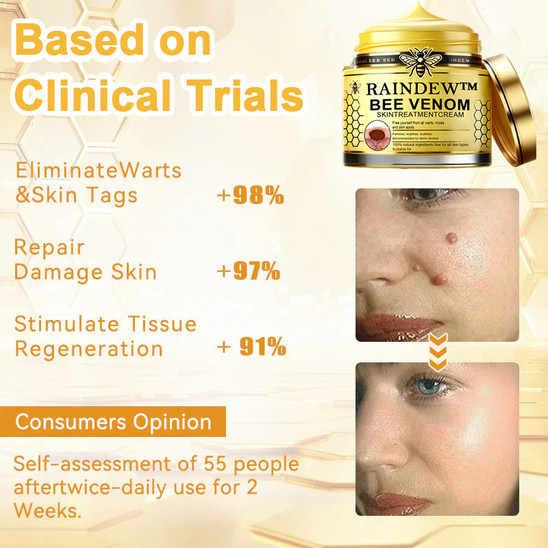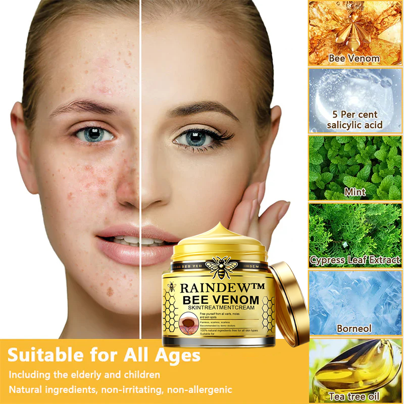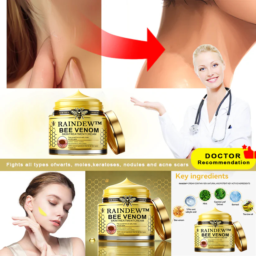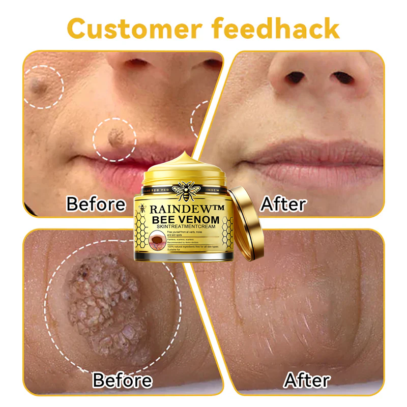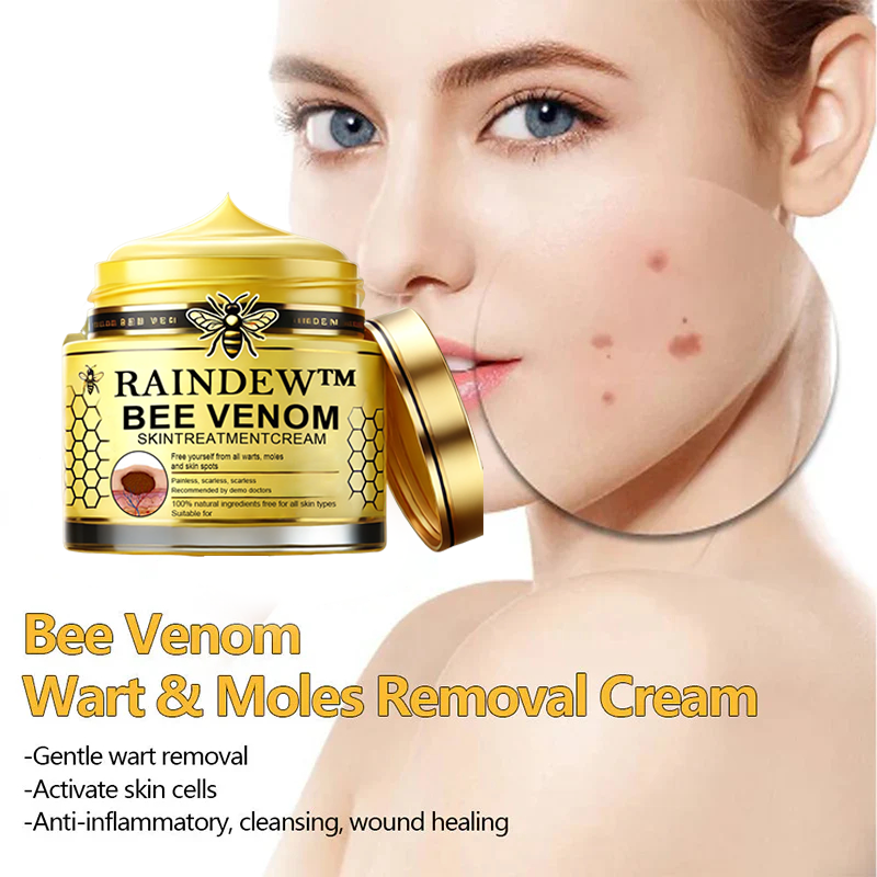Raindew™ Bee Venom Treatment Cream provides a solution by harnessing the potent properties of bee venom to target various skin irregularities such as skin tags, moles, warts, and blemishes. Enriched with active ingredients from bee venom, this advanced formula works to break down and gently remove unwanted growths.